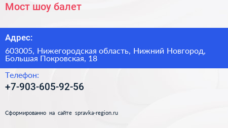 Мост, шоу-балет по адресу 603005, Нижегородская область, Нижний Новгород, Большая Покровская, 18 в дальнейшем Организация, размещена в следующих категориях:
