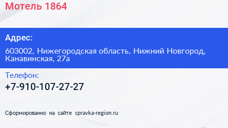 Мотель 1864 по адресу 603002, Нижегородская область, Нижний Новгород, Канавинская, 27а в дальнейшем Организация, размещена в следующих категориях: