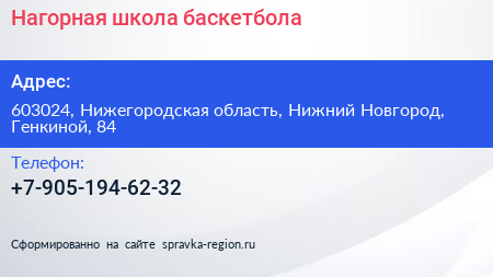 Нагорная, школа баскетбола по адресу 603024, Нижегородская область, Нижний Новгород, Генкиной, 84 в дальнейшем Организация, размещена в следующих категориях: