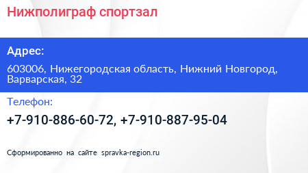 Нижполиграф, спортзал по адресу 603006, Нижегородская область, Нижний Новгород, Варварская, 32 в дальнейшем Организация, размещена в следующих категориях: