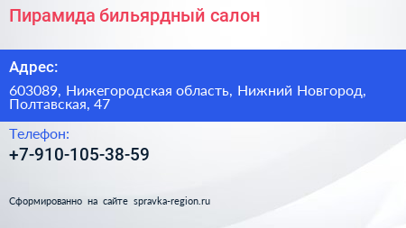 Пирамида, бильярдный салон по адресу 603089, Нижегородская область, Нижний Новгород, Полтавская, 47 в дальнейшем Организация, размещена в следующих категориях: