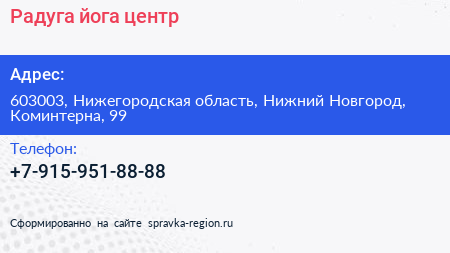 Радуга, йога-центр по адресу 603003, Нижегородская область, Нижний Новгород, Коминтерна, 99 в дальнейшем Организация, размещена в следующих категориях: