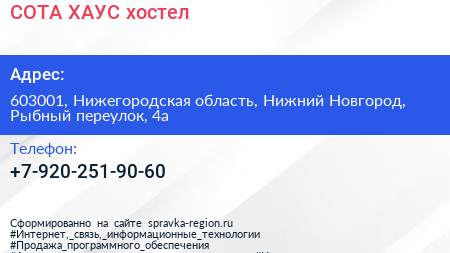 СОТА ХАУС, хостел по адресу 603001, Нижегородская область, Нижний Новгород, Рыбный переулок, 4а в дальнейшем Организация, размещена в следующих категориях: