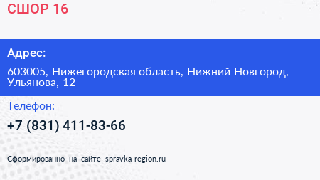 СШОР № 16 по адресу 603005, Нижегородская область, Нижний Новгород, Ульянова, 12 в дальнейшем Организация, размещена в следующих категориях: