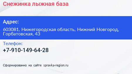 Снежинка, лыжная база по адресу 603081, Нижегородская область, Нижний Новгород, Горбатовская, 43 в дальнейшем Организация, размещена в следующих категориях: