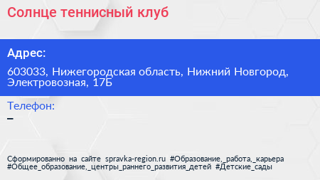 Солнце, теннисный клуб по адресу 603033, Нижегородская область, Нижний Новгород, Электровозная, 17Б в дальнейшем Организация, размещена в следующих категориях: