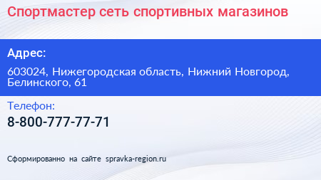 Спортмастер, сеть спортивных магазинов по адресу 603024, Нижегородская область, Нижний Новгород, Белинского, 61 в дальнейшем Организация, размещена в следующих категориях: