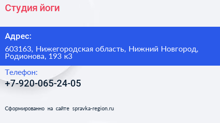 Студия йоги по адресу 603163, Нижегородская область, Нижний Новгород, Родионова, 193 к3 в дальнейшем Организация, размещена в следующих категориях: