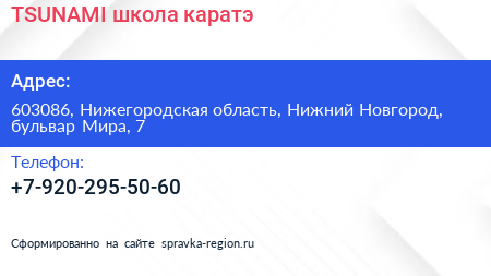 TSUNAMI, школа каратэ по адресу 603086, Нижегородская область, Нижний Новгород, бульвар Мира, 7 в дальнейшем Организация, размещена в следующих категориях: