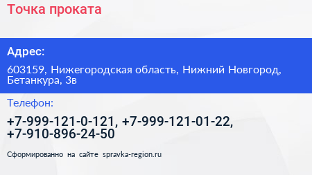 Точка проката по адресу 603159, Нижегородская область, Нижний Новгород, Бетанкура, 3в в дальнейшем Организация, размещена в следующих категориях: