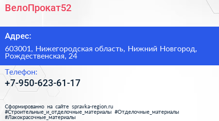ВелоПрокат52 по адресу 603001, Нижегородская область, Нижний Новгород, Рождественская, 24 в дальнейшем Организация, размещена в следующих категориях: