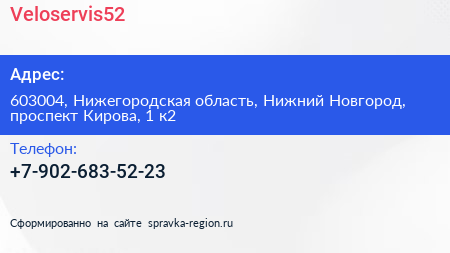 Veloservis52 по адресу 603004, Нижегородская область, Нижний Новгород, проспект Кирова, 1 к2 в дальнейшем Организация, размещена в следующих категориях: