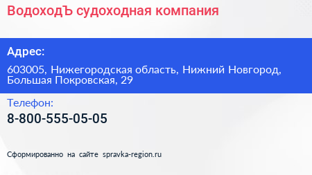 ВодоходЪ, судоходная компания по адресу 603005, Нижегородская область, Нижний Новгород, Большая Покровская, 29 в дальнейшем Организация, размещена в следующих категориях: