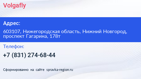 Volgafly по адресу 603107, Нижегородская область, Нижний Новгород, проспект Гагарина, 178т в дальнейшем Организация, размещена в следующих категориях: