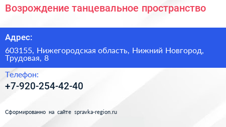Возрождение, танцевальное пространство по адресу 603155, Нижегородская область, Нижний Новгород, Трудовая, 8 в дальнейшем Организация, размещена в следующих категориях: