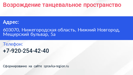 Возрождение, танцевальное пространство по адресу 603070, Нижегородская область, Нижний Новгород, Мещерский бульвар, 5а в дальнейшем Организация, размещена в следующих категориях: