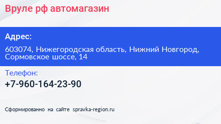 Вруле.рф, автомагазин по адресу 603074, Нижегородская область, Нижний Новгород, Сормовское шоссе, 14 в дальнейшем Организация, размещена в следующих категориях: