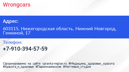 Wrongcars по адресу 603115, Нижегородская область, Нижний Новгород, Генкиной, 17 в дальнейшем Организация, размещена в следующих категориях: