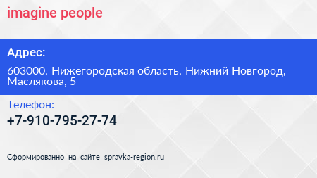 imagine people по адресу 603000, Нижегородская область, Нижний Новгород, Маслякова, 5 в дальнейшем Организация, размещена в следующих категориях: