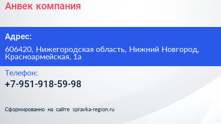Анвек, компания по адресу 606420, Нижегородская область, Нижний Новгород, Красноармейская, 1а в дальнейшем Организация, размещена в следующих категориях: