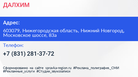 ДАЛХИМ по адресу 603079, Нижегородская область, Нижний Новгород, Московское шоссе, 83а в дальнейшем Организация, размещена в следующих категориях: