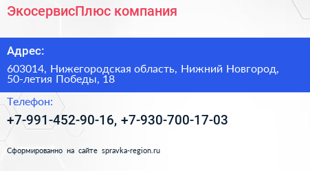 ЭкосервисПлюс, компания по адресу 603014, Нижегородская область, Нижний Новгород, 50-летия Победы, 18 в дальнейшем Организация, размещена в следующих категориях: