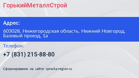ГорькийМеталлСтрой по адресу 603028, Нижегородская область, Нижний Новгород, Базовый проезд, 1а в дальнейшем Организация, размещена в следующих категориях: