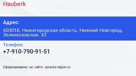 Hauberk по адресу 603018, Нижегородская область, Нижний Новгород, Зеленхозовская, 10 в дальнейшем Организация, размещена в следующих категориях: