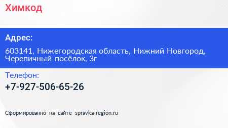 Химкод по адресу 603141, Нижегородская область, Нижний Новгород, Черепичный посёлок, 3г в дальнейшем Организация, размещена в следующих категориях: