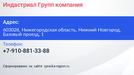 Индастриал Групп, компания по адресу 603028, Нижегородская область, Нижний Новгород, Базовый проезд, 1 в дальнейшем Организация, размещена в следующих категориях: