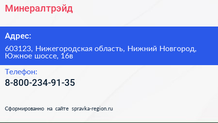 Минералтрэйд по адресу 603123, Нижегородская область, Нижний Новгород, Южное шоссе, 16в в дальнейшем Организация, размещена в следующих категориях: