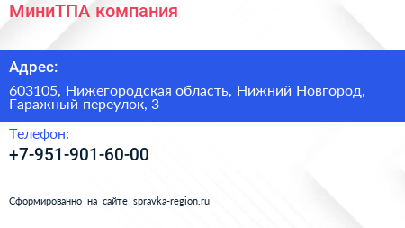 МиниТПА, компания по адресу 603105, Нижегородская область, Нижний Новгород, Гаражный переулок, 3 в дальнейшем Организация, размещена в следующих категориях: