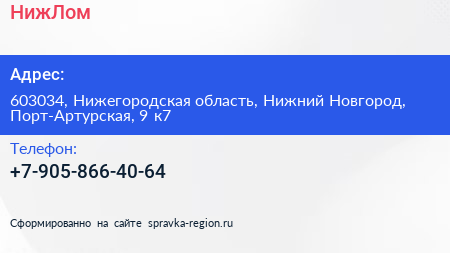 НижЛом по адресу 603034, Нижегородская область, Нижний Новгород, Порт-Артурская, 9 к7 в дальнейшем Организация, размещена в следующих категориях: