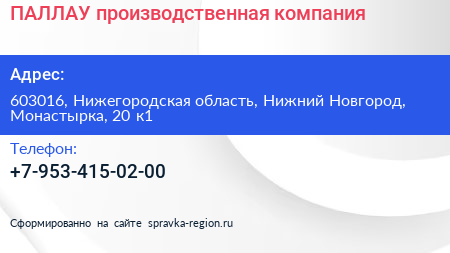 ПАЛЛАУ, производственная компания по адресу 603016, Нижегородская область, Нижний Новгород, Монастырка, 20 к1 в дальнейшем Организация, размещена в следующих категориях: