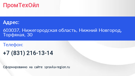ПромТехОйл по адресу 603037, Нижегородская область, Нижний Новгород, Торфяная, 30 в дальнейшем Организация, размещена в следующих категориях: