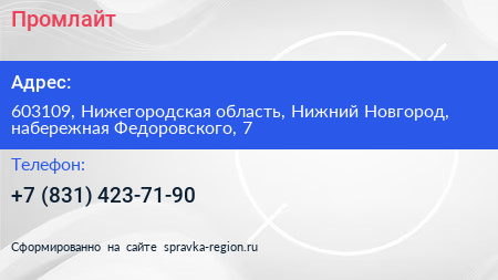Промлайт по адресу 603109, Нижегородская область, Нижний Новгород, набережная Федоровского, 7 в дальнейшем Организация, размещена в следующих категориях: