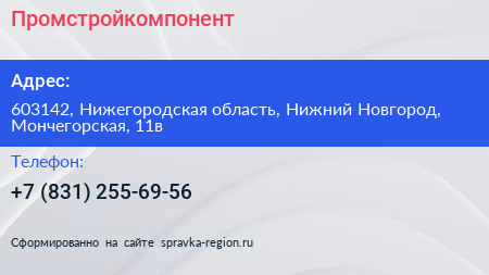 Промстройкомпонент по адресу 603142, Нижегородская область, Нижний Новгород, Мончегорская, 11в в дальнейшем Организация, размещена в следующих категориях: