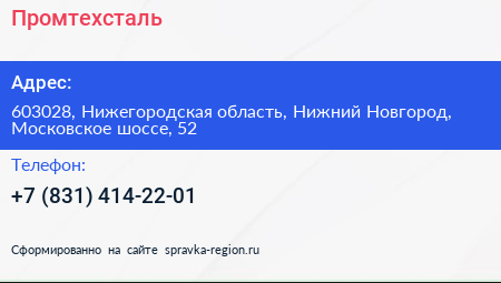 Промтехсталь по адресу 603028, Нижегородская область, Нижний Новгород, Московское шоссе, 52 в дальнейшем Организация, размещена в следующих категориях: