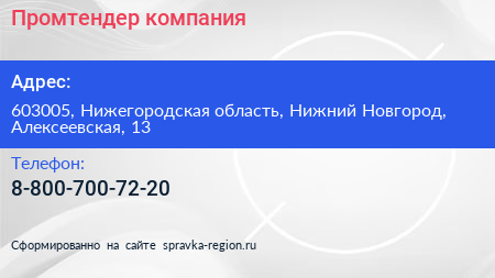 Промтендер, компания по адресу 603005, Нижегородская область, Нижний Новгород, Алексеевская, 13 в дальнейшем Организация, размещена в следующих категориях: