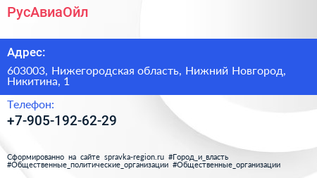 РусАвиаОйл по адресу 603003, Нижегородская область, Нижний Новгород, Никитина, 1 в дальнейшем Организация, размещена в следующих категориях: