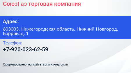 СоюзГаз, торговая компания по адресу 603003, Нижегородская область, Нижний Новгород, Баррикад, 1 в дальнейшем Организация, размещена в следующих категориях: