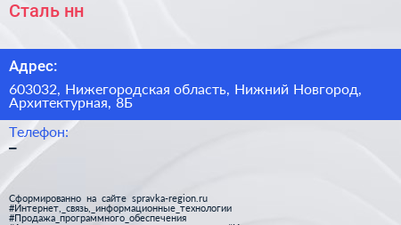 Сталь-нн по адресу 603032, Нижегородская область, Нижний Новгород, Архитектурная, 8Б в дальнейшем Организация, размещена в следующих категориях: