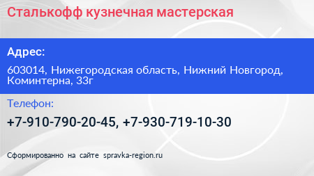 Сталькофф, кузнечная мастерская по адресу 603014, Нижегородская область, Нижний Новгород, Коминтерна, 33г в дальнейшем Организация, размещена в следующих категориях: