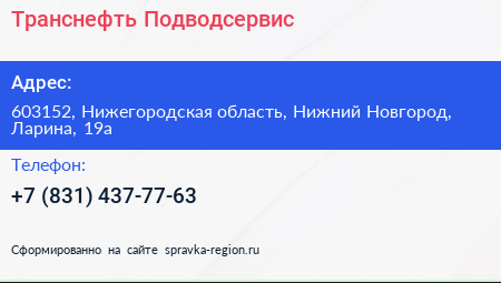 Транснефть-Подводсервис по адресу 603152, Нижегородская область, Нижний Новгород, Ларина, 19а в дальнейшем Организация, размещена в следующих категориях: