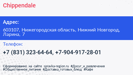Chippendale по адресу 603107, Нижегородская область, Нижний Новгород, Ларина, 7 в дальнейшем Организация, размещена в следующих категориях: