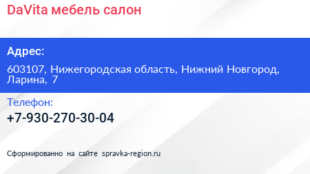 DaVita-мебель, салон по адресу 603107, Нижегородская область, Нижний Новгород, Ларина, 7 в дальнейшем Организация, размещена в следующих категориях: