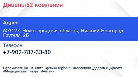 Диваны52, компания по адресу 603127, Нижегородская область, Нижний Новгород, Гаугеля, 2Б в дальнейшем Организация, размещена в следующих категориях: