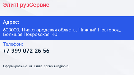 ЭлитГрузСервис по адресу 603000, Нижегородская область, Нижний Новгород, Большая Покровская, 40 в дальнейшем Организация, размещена в следующих категориях: