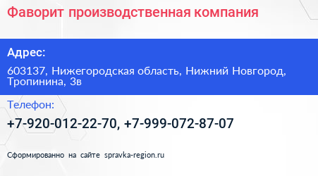 Фаворит, производственная компания по адресу 603137, Нижегородская область, Нижний Новгород, Тропинина, 3в в дальнейшем Организация, размещена в следующих категориях: