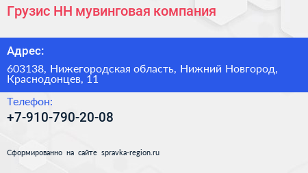 Грузис НН, мувинговая компания по адресу 603138, Нижегородская область, Нижний Новгород, Краснодонцев, 11 в дальнейшем Организация, размещена в следующих категориях: